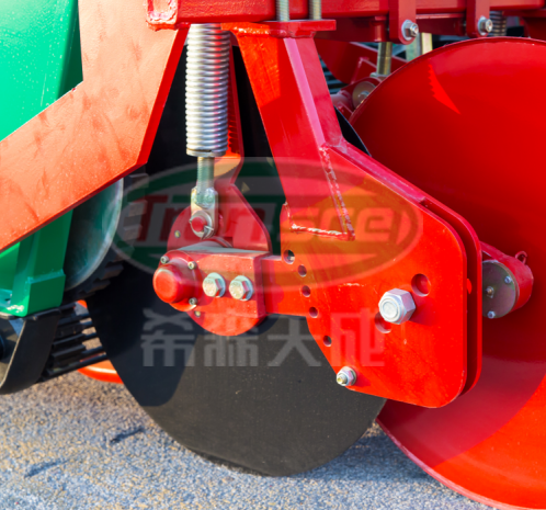 主要由圆盘刀、固定架、压簧、调整装置组成,圆盘刀无动力驱动,靠摩擦力运转,主要用来将沿薯垄两边的地表连同杂草切开,利于挖掘部件挖掘,同时防止机器两侧茎蔓、杂草缠绕堵塞。